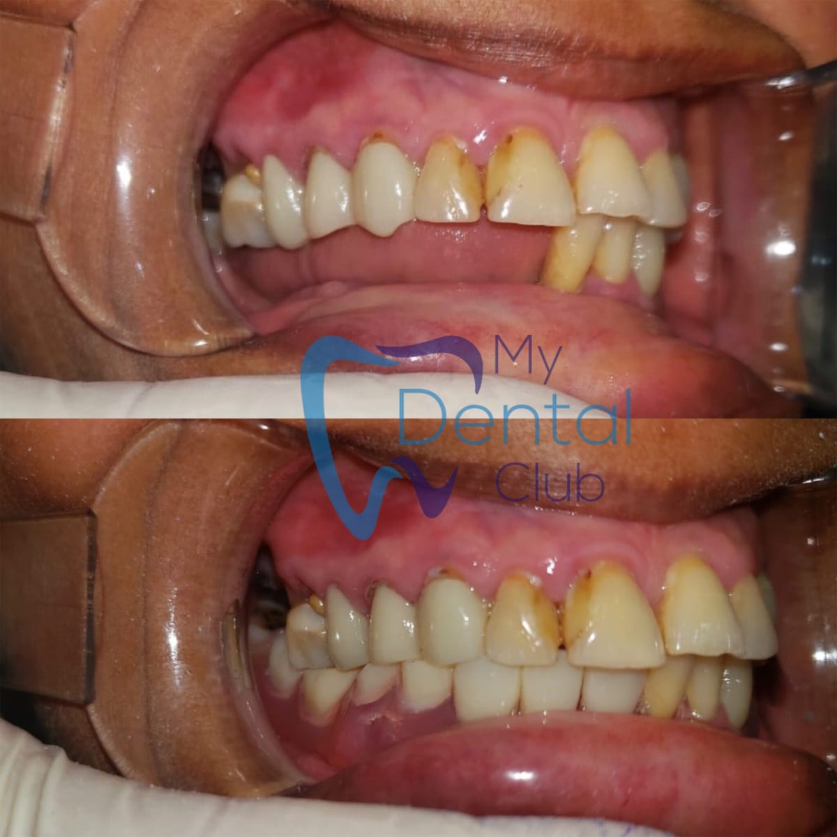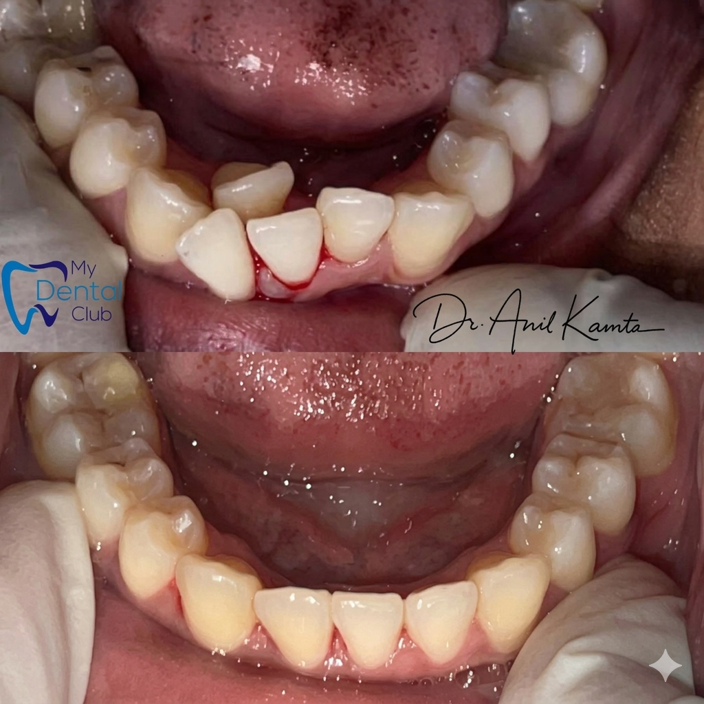 This before-and-after case highlights a successful lower teeth alignment correction performed at My Dental Club TT. The patient initially presented with crowding and misalignment in the lower front teeth, along with gum irritation.